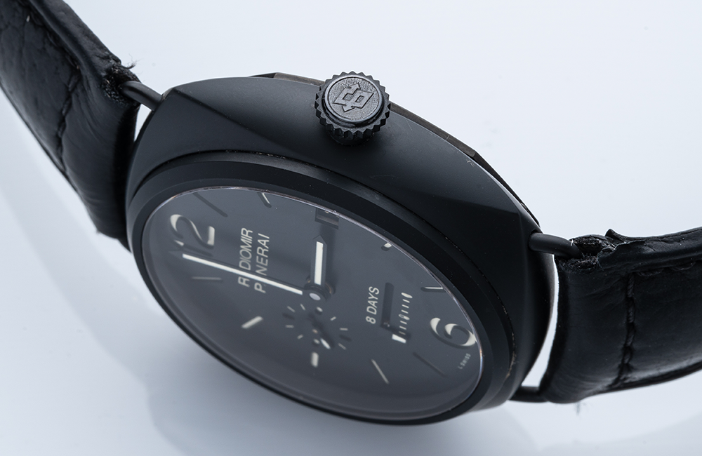 この大胆なサイズ感は軍用時計としての視認性を高めるために設計されたものであり、パネライ独特のデザインアイコンとなっています。